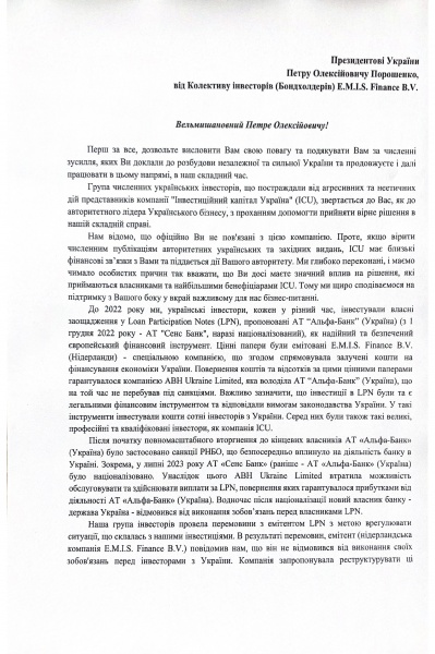 Як зазначається у листі, інвестори вкладали кошти в цінні папери компанії E.M.I.S. Finance B.V., які у попередні роки продавалися та обслуговувались через низку фінансових установ, у тому числі “Сенс Банк”. Однак, після введення санкцій проти колишніх власників банку, обслуговування цих паперів було припинено. Разом з тим нідерландська компанія E.M.I.S. Finance B.V. запропонувала реструктуризацію зобов’язань, на яку погодилася більшість власників цінних паперів – LPN. На жаль, компанія ICU, яка володіє контрольним пакетом у двох із десяти серій LPN, виступила проти цієї реструктуризації. Це, на думку інвесторів, заблокувало справедливий вихід із ситуації для сотень невеликих українських інвесторів. Вони вважають, що ICU сповідує стратегію так званого “vulture fund” — фонду, який скуповує борги зі знижкою і чекає на відновлення емітента для отримання максимального прибутку.