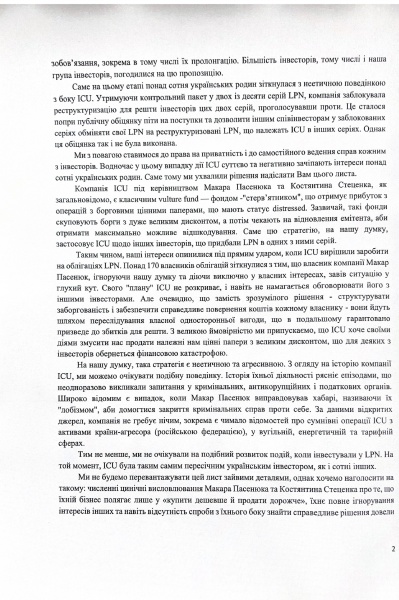 Ініціатори листа наголошують, що з повагою ставляться до права на приватність та самостійне ведення справ кожним з інвесторів. Однак сьогоднішні дії ICU суттєво та негативно зачіпають інтереси понад сотні українських родин. Більше 170 дрібних власників облігацій зіткнулися з тим, що ICU ігнорує думку та права інших інвесторів та діє виключно у власних інтересах.