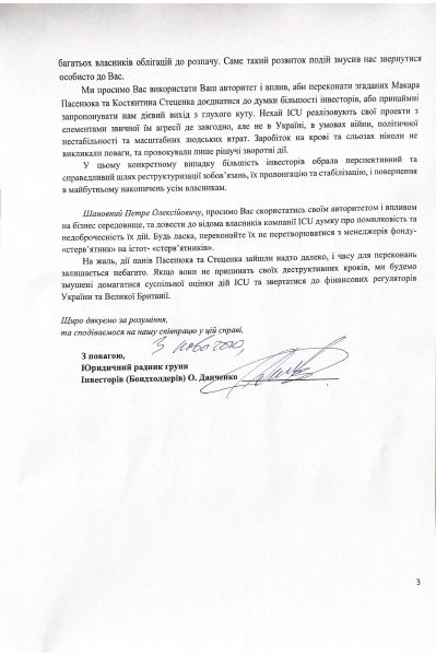 “Якщо авторитет Петра Порошенка не призведе до нормалізації ситуації, група інвесторів має намір домагатися суспільної оцінки дій ICU та звернеться до фінансових регуляторів України та Великої Британії“, – резюмується у зверненні.